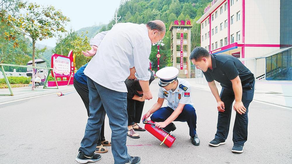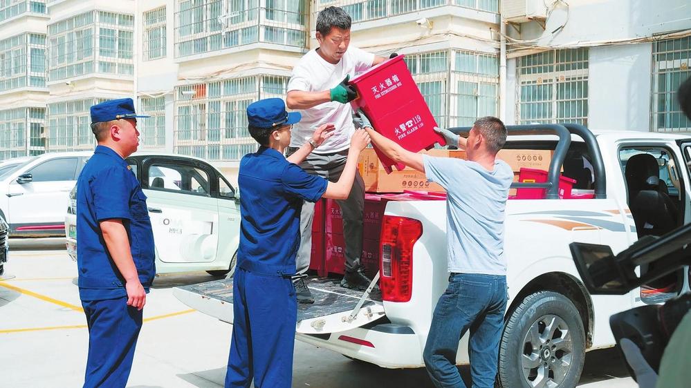 消防人員給群眾發(fā)放消防器材。