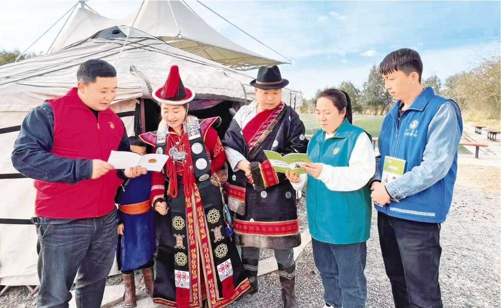 黨城灣鎮(zhèn)綜治中心組織網(wǎng)格員走進牧區(qū)開展法治宣傳活動(2024年8月20日拍攝)。 肅北縣委政法委供圖