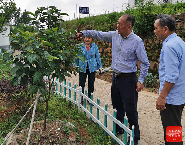 圖為江西省紀(jì)委監(jiān)委駐村工作隊(duì)員正在與村民交流果樹種植技術(shù)。