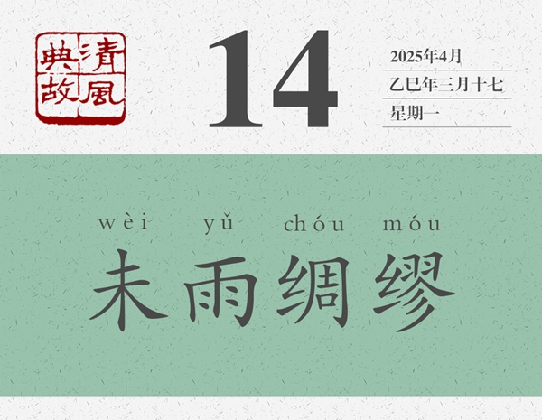 這是一首寓言詩。一般認為,是周武王病故后,弟弟周公旦寫給周武王的兒子周成王的誡勉詩。時成王幼弱,周公旦以詩言志,以鳥為喻,表明自己對周成王的一片苦心,以及對國事的一片忠心。“迨天之未陰雨,徹彼桑土,綢繆牖戶”,便形象地表明了自己的一片苦心。后人遂以“未雨綢繆”為典,比喻凡事都應(yīng)提前做好準備,以防事到臨頭難以應(yīng)對。《朱子家訓(xùn)》:“宜未雨而綢繆,毋臨渴而掘井。”