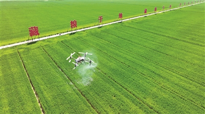 近年來,江蘇省宿遷市宿豫區(qū)多措并舉推動(dòng)耕地保護(hù)責(zé)任落實(shí),加快現(xiàn)代農(nóng)業(yè)產(chǎn)業(yè)園核心區(qū)建設(shè),保障糧食穩(wěn)產(chǎn)增產(chǎn)。圖為近日,在該區(qū)新莊小麥單產(chǎn)提升示范區(qū),無人機(jī)正在進(jìn)行植保噴灑作業(yè)。朱冠軍 攝