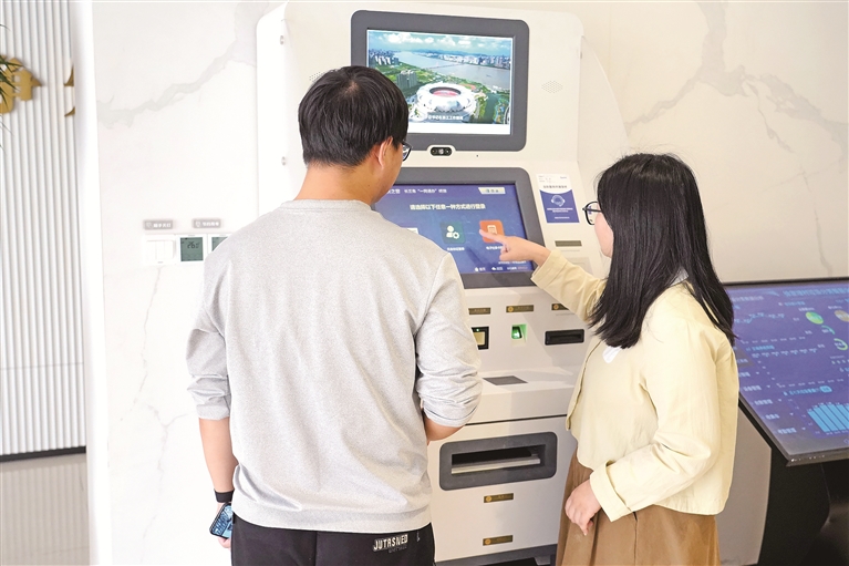 5月10日,浙江省平湖市林埭鎮(zhèn)徐家埭村的數(shù)智生活館內(nèi),村民在工作人員的幫助下,使用政務(wù)服務(wù)長(zhǎng)三角“一網(wǎng)通辦”終端辦理業(yè)務(wù)。金苗 攝