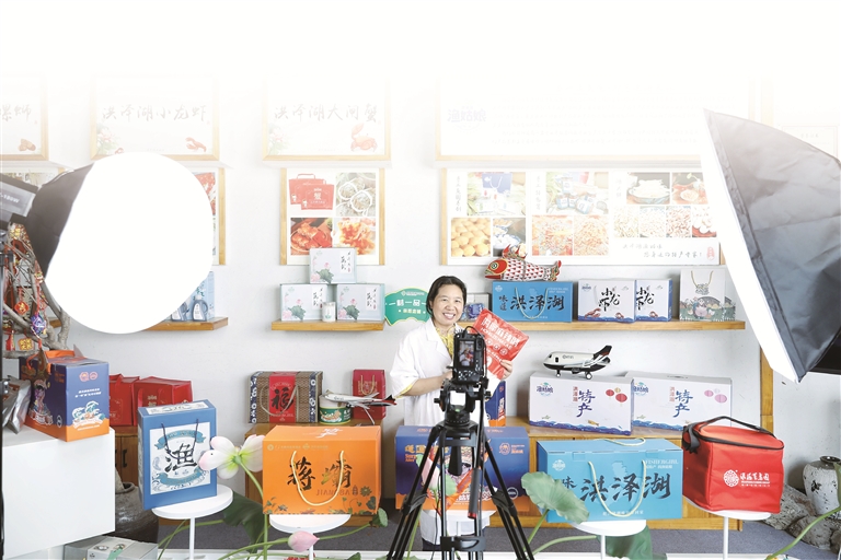 5月21日,江蘇省淮安市洪澤區(qū)“漁姑娘”助農(nóng)直播間內(nèi),主播正在向網(wǎng)友介紹當(dāng)?shù)靥厣r(nóng)產(chǎn)品。陳凱 攝