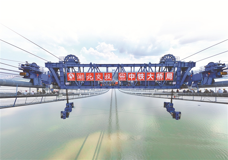 那就自己創(chuàng)造經(jīng)驗!湖北交投牽頭聯(lián)合承建單位,在大橋建設前期進行了大量數(shù)據(jù)論證和可行性試驗,一次次研究優(yōu)化施工方案。他們堅持設備優(yōu)化與工藝創(chuàng)新“雙管齊下”,應用纜載吊機、液壓提升裝置等裝備創(chuàng)新施工方法,順利攻克了難關(guān)。