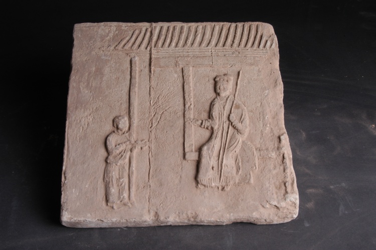 宋代??v30.2厘米,橫30.7厘米,厚3厘米。征集。磚呈長方形,青灰色,通過模印工藝展示了屋檐下一婦人坐于窗臺前,給一端物的幼子訓(xùn)話的場景,是研究宋代社會生活、家庭倫理及畫像磚藝術(shù)的珍貴實(shí)物資料。