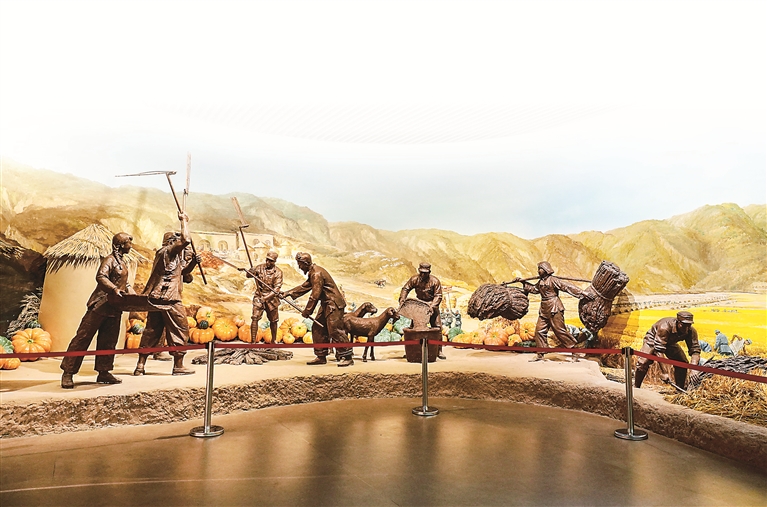 南泥灣大生產(chǎn)紀(jì)念館內(nèi)的雕塑作品。中國共產(chǎn)黨領(lǐng)導(dǎo)抗日軍民自力更生、艱苦奮斗,把南泥灣變成“陜北的好江南”。新華社記者 樊雨晴 攝