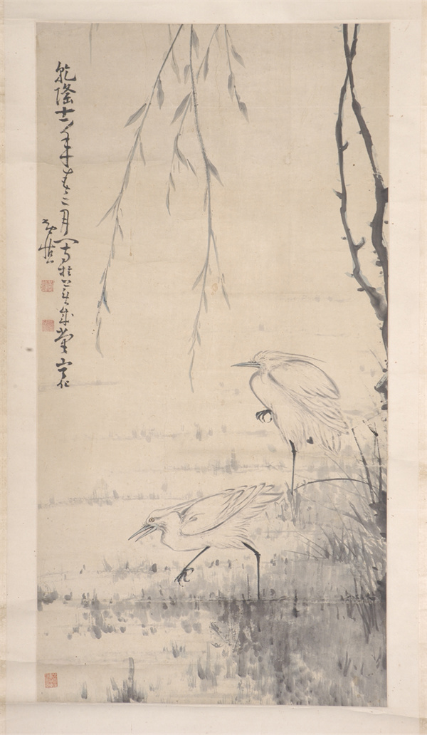 清代,水墨設色花鳥畫立軸,紙本,作者黃慎??v高1126厘米,橫寬57.4厘米。款署“乾隆十一年春二月寫于蕪成堂寧化黃慎”。鈐“黃慎”白文方印,“癭瓢”白文方印。柳枝自畫面上方垂下,疏落的柳葉隨風搖曳。池塘兩只白鷺,一只閉目獨立,一只行走覓食。黃慎,福建寧化人,書畫家,為“揚州八怪”之一。