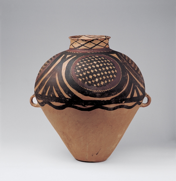 馬廠類型,蘭州市土谷臺(tái)出土。口徑13.9厘米,底徑12厘米,高44.5厘米。泥質(zhì)橙黃陶。施黑,紅彩,口內(nèi)繪一圈帶紋和連弧紋,頸部繪菱格紋,肩腹部用黑紅兩色繪二方連續(xù)的四大圓圈紋,圓圈內(nèi)填方格紋。腹中部繪黑色帶紋和一圈水波紋。四大圓圈紋,顯示了馬廠類型彩陶的獨(dú)特文化風(fēng)格。