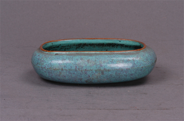清代,高2.8厘米,口徑8.8×5厘米。橢圓口,扁腹。通體施藍(lán)綠釉,醬黃釉口。
