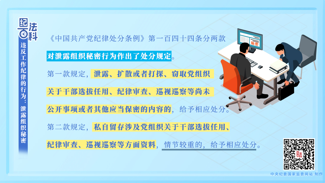 “嚴(yán)守黨的紀(jì)律,保守黨的秘密”,是每名黨員入黨宣誓時的鄭重承諾。無論選人用人工作、紀(jì)律審查工作,還是巡視巡察等工作,都有嚴(yán)格的保密紀(jì)律?!饵h政領(lǐng)導(dǎo)干部選拔任用工作條例》規(guī)定,選拔任用黨政領(lǐng)導(dǎo)干部,不準(zhǔn)私自泄露研判、動議、民主推薦、民主測評、考察、醞釀、討論決定干部等有關(guān)情況。《中國共產(chǎn)黨紀(jì)律檢查機(jī)關(guān)監(jiān)督執(zhí)紀(jì)工作規(guī)則》規(guī)定,監(jiān)督執(zhí)紀(jì)人員不準(zhǔn)私自留存問題線索和涉案資料,嚴(yán)禁泄露審查調(diào)查工作情況,對紀(jì)檢干部私存線索、跑風(fēng)漏氣、違反安全保密規(guī)定等違紀(jì)行為要嚴(yán)肅處理。《中國共產(chǎn)黨巡視工作條例》規(guī)定,巡視工作人員私自留存巡視工作資料,泄露與巡視工作有關(guān)的未公開信息的,要給予處理處分。