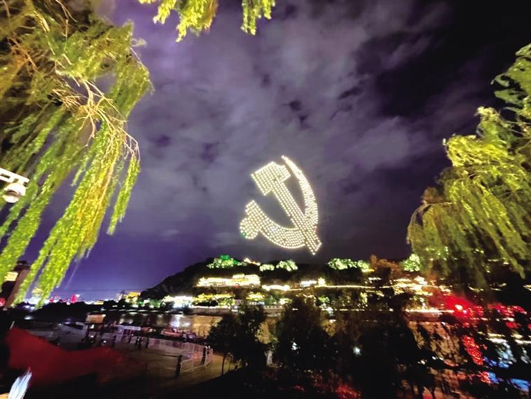 中國(guó)甘肅網(wǎng)7月1日訊 據(jù)蘭州日?qǐng)?bào)報(bào)道記者 王瀟旋 攝)為慶祝中國(guó)共產(chǎn)黨成立100周年,6月30日晚,深圳、合肥、鄭州、蘭州等地上演光影盛宴。蘭州用燈光和無(wú)人機(jī)扮靚城市夜空,為黨的生日獻(xiàn)上璀璨光影華美的祝福。