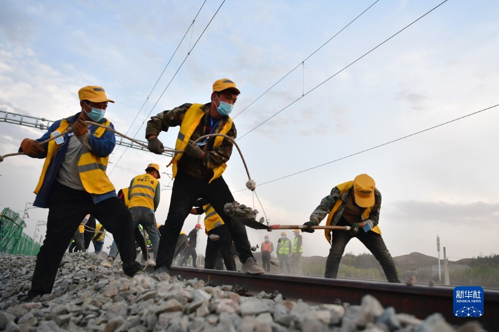 中鐵十一局建設(shè)者在中蘭客專(甘肅段)接入中川城際鐵路道岔插鋪施工現(xiàn)場(chǎng)作業(yè)(4月26日攝)。新華社記者 陳斌 攝