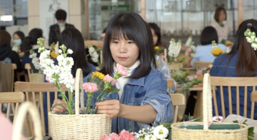 繁花似錦報(bào)春來,天姿國色抒情懷?;顒?dòng)現(xiàn)場花香四溢、芬芳溫馨,充滿著春天般的氣息,大家手捧鮮花,在花藝?yán)蠋煹闹v解下,開始學(xué)習(xí)各種鮮花所蘊(yùn)含的花語祝福和選花、裁剪、搭配、造型及養(yǎng)護(hù)等藝術(shù)插花技巧。隨后,女工們將原本普普通通的月季、康乃馨、蝴蝶蘭、滿天星、向日葵等多種花材修剪整枝,根據(jù)不同的色彩和形狀有層次地搭配在一起。通過精心構(gòu)思造型、發(fā)揮創(chuàng)意想象,有的注重意境創(chuàng)設(shè)追求,有的突出枝情花韻之趣,有的抒展自然樸實(shí)風(fēng)格……在細(xì)致地修飾和精心地創(chuàng)作下,一枝花、一棵草都變得詩情畫意和清新怡人,節(jié)日的喜慶氣氛瞬間升騰。
