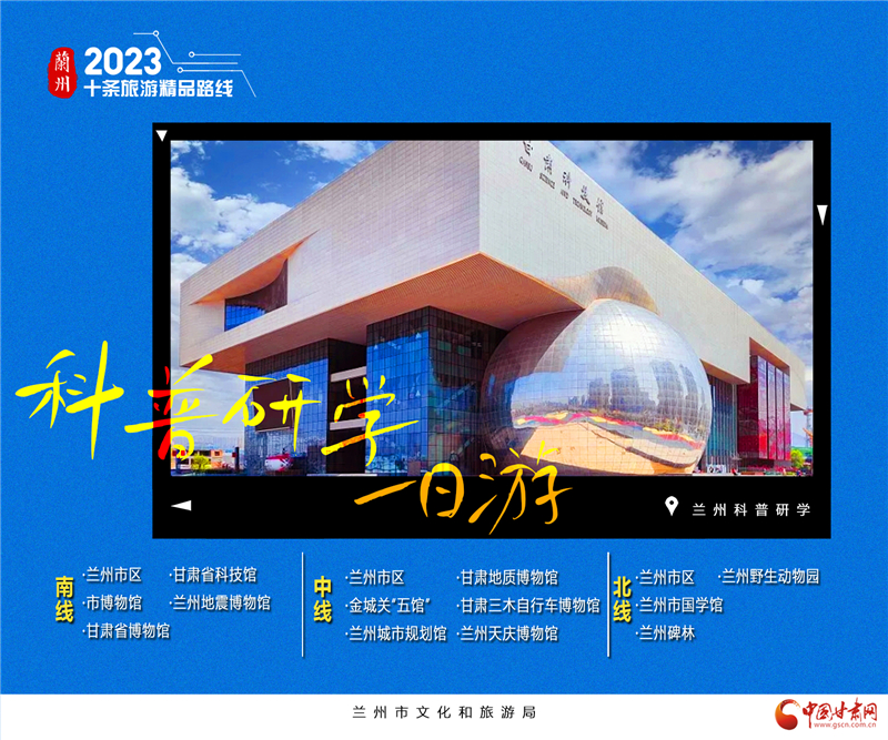 6.蘭州科普研學(xué)1日游。蘭州博物館有很多,可謂是品類(lèi)齊全。綜合類(lèi)博物館如省博、市博自不用說(shuō),中國(guó)旅游標(biāo)志“馬踏飛燕”原件陳列真的不想去看看?各類(lèi)專(zhuān)門(mén)博物館也是非常齊全,秦腔博物館、黃河橋梁博物館、城市規(guī)劃館、自行車(chē)博物館、地震博物館等……“蘭州科普研學(xué)1日游”三條線(xiàn),分別為南線(xiàn)、中線(xiàn)和北線(xiàn)。