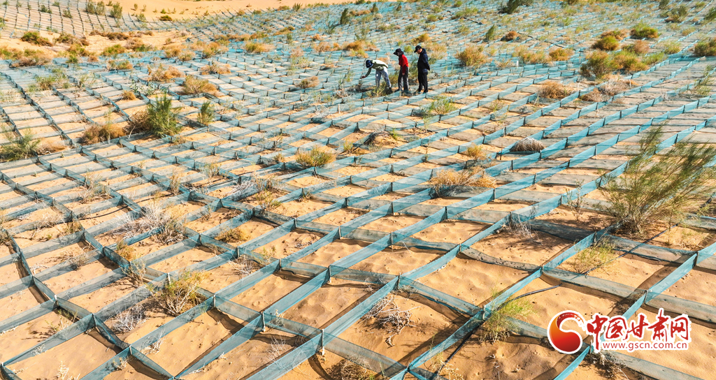 連日來,甘肅省張掖市臨澤、高臺北部荒漠區(qū)防沙治沙區(qū)內(nèi),群眾在防沙治沙工程現(xiàn)場共同壓沙障、栽梭梭、澆水管護、筑牢“阻沙網(wǎng)”,塑緊“防沙衣”,連綿起伏的沙漠上,麥草方格沙障一望無際,栽植的梭梭等植物迎風(fēng)挺立,煥發(fā)蓬勃生機。