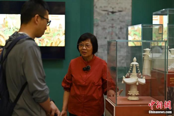2023年7月14日,孫毅華向中新社記者介紹敦煌壁畫(huà)中的建筑形象。李亞龍 攝