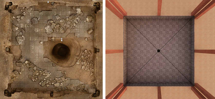 中部夯土臺(tái)基的中心發(fā)現(xiàn)一處神秘的半地穴空間。它的地面鋪素磚,四壁貼壁磚并用鐵釘固定,各磚縫之間還用特殊材料專門做了“美縫”處理。種種跡象表明此處可能是一個(gè)“水池”,但中間被一口豎井狀大坑破壞。