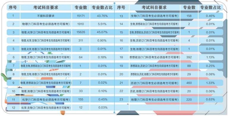 據(jù)了解,根據(jù)《甘肅省深化高等學??荚囌猩C合改革實施方案》要求,從 2021年秋季入學的普通高中一年級學生開始,實行基于統(tǒng)一高考和高中學業(yè)水平考試成績、參考綜合素質評價的高??荚囌猩J健5?024年,基本形成分類考試、綜合評價、多元錄取的高??荚囌猩贫?,健全促進公平、科學選才、監(jiān)督有力的高??荚囌猩w制機制。此次在我省報送選考科目要求的高校專業(yè)共計64092條,其中本科專業(yè)34670條。專業(yè)選考科目要求共有23種組合,其中不提科目要求的本科專業(yè)數(shù)量占本科專業(yè)總數(shù)的43.76%,含物理科目的占比為51.79%,含化學科目的占比為46.46%,含歷史科目的占比為1.74%,含“物理+化學”科目的占比為45.98%。