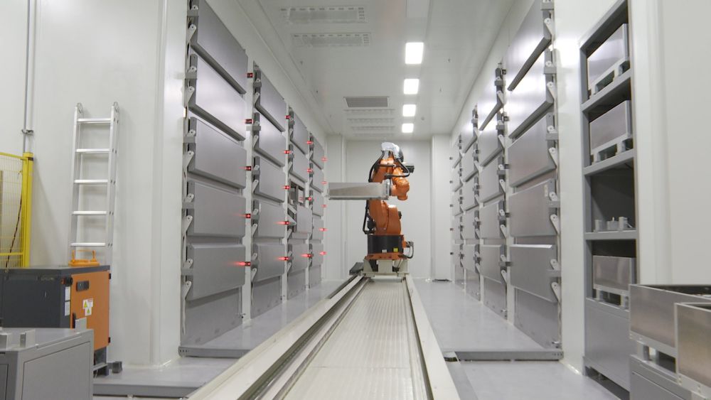 在一家企業(yè)的干燥車間內(nèi),六軸機(jī)器人正在搬運成品電池。(受訪單位供圖)