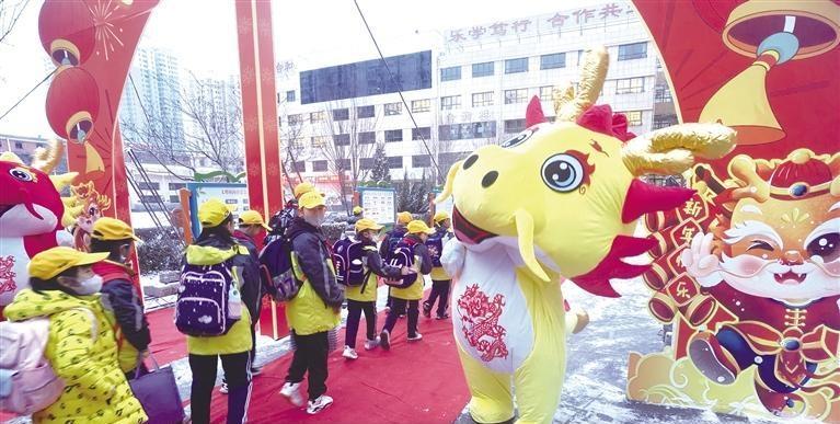 當(dāng)日上午7時(shí)許,記者在蘭州市東郊學(xué)??吹?,校門(mén)內(nèi)兩邊擺放著兩條由數(shù)百個(gè)氣球組成的長(zhǎng)龍。高年級(jí)段和低年級(jí)段的學(xué)生要穿越寫(xiě)著“龍騰虎躍,前程似錦”的龍門(mén),方可進(jìn)入教室。同時(shí),兩邊的老師,給每一位到校的學(xué)生發(fā)放小禮物。記者注意到,每個(gè)孩子都領(lǐng)到了一個(gè)小盲盒,里面裝著不同的文具。孩子們高興地?fù)]舞著手中的盲盒,展示新春的快樂(lè)。