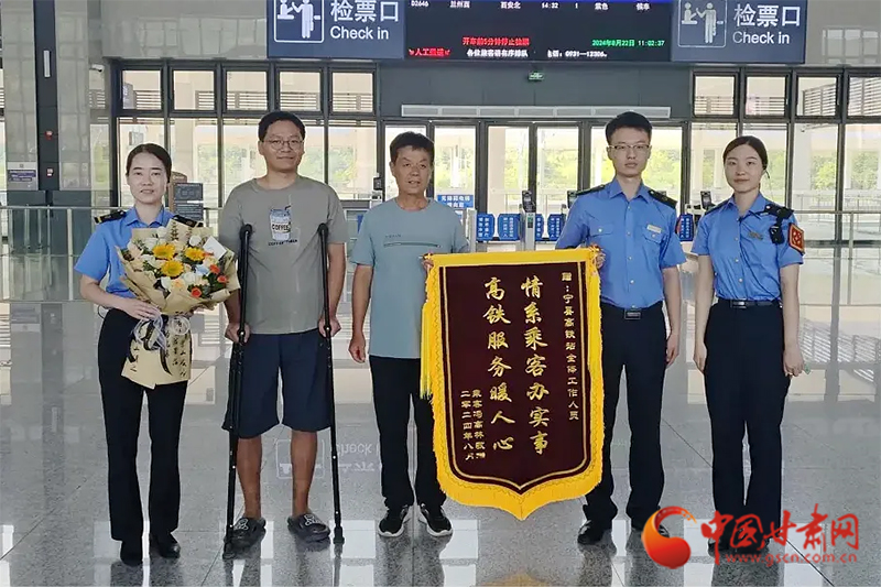 中國甘肅網(wǎng)8月29日訊(西北角·中國甘肅網(wǎng)記者 沈文剛 通訊員 閆軍 王梁)8月22日,正值處暑節(jié)氣。隴東地區(qū)籠罩在“秋老虎”的悶熱之中。上午10時,一位拄著雙拐的男士在家人陪伴下,帶著鮮花和錦旗來到銀西高鐵寧縣站候車室。
