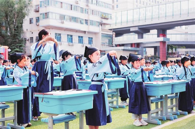 中國甘肅網(wǎng)9月2日訊 據(jù)蘭州晨報報道(奔流新聞·蘭州晨報記者裴強(qiáng)) 8月30日,蘭州市七里河教育集團(tuán)為七里河小學(xué)和中車分校的600名一年級新生舉行入學(xué)“開筆禮”儀式。開筆禮在中國傳統(tǒng)文化中是對少兒識字習(xí)禮的稱謂,是標(biāo)志少兒進(jìn)入學(xué)習(xí)階段的重要紀(jì)念,是中國古代人生的首次大禮,孩子將要入學(xué)讀書寫字、習(xí)禮之時的一個傳統(tǒng)禮節(jié)。兩所學(xué)校600名一年級新生“端正衣冠”“感恩先賢”“朱砂啟智”“擊鼓鳴志”“啟蒙描紅”,體驗(yàn)傳統(tǒng)“開筆禮”儀式。