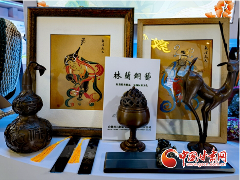 在甘肅館內(nèi)的林蘭銅藝展區(qū),白銀林蘭銅藝文化發(fā)展有限公司負責人馬艷萍一邊向觀展賓客介紹自己的產(chǎn)品,一邊向大家推介自己的家鄉(xiāng)—甘肅省白銀市。