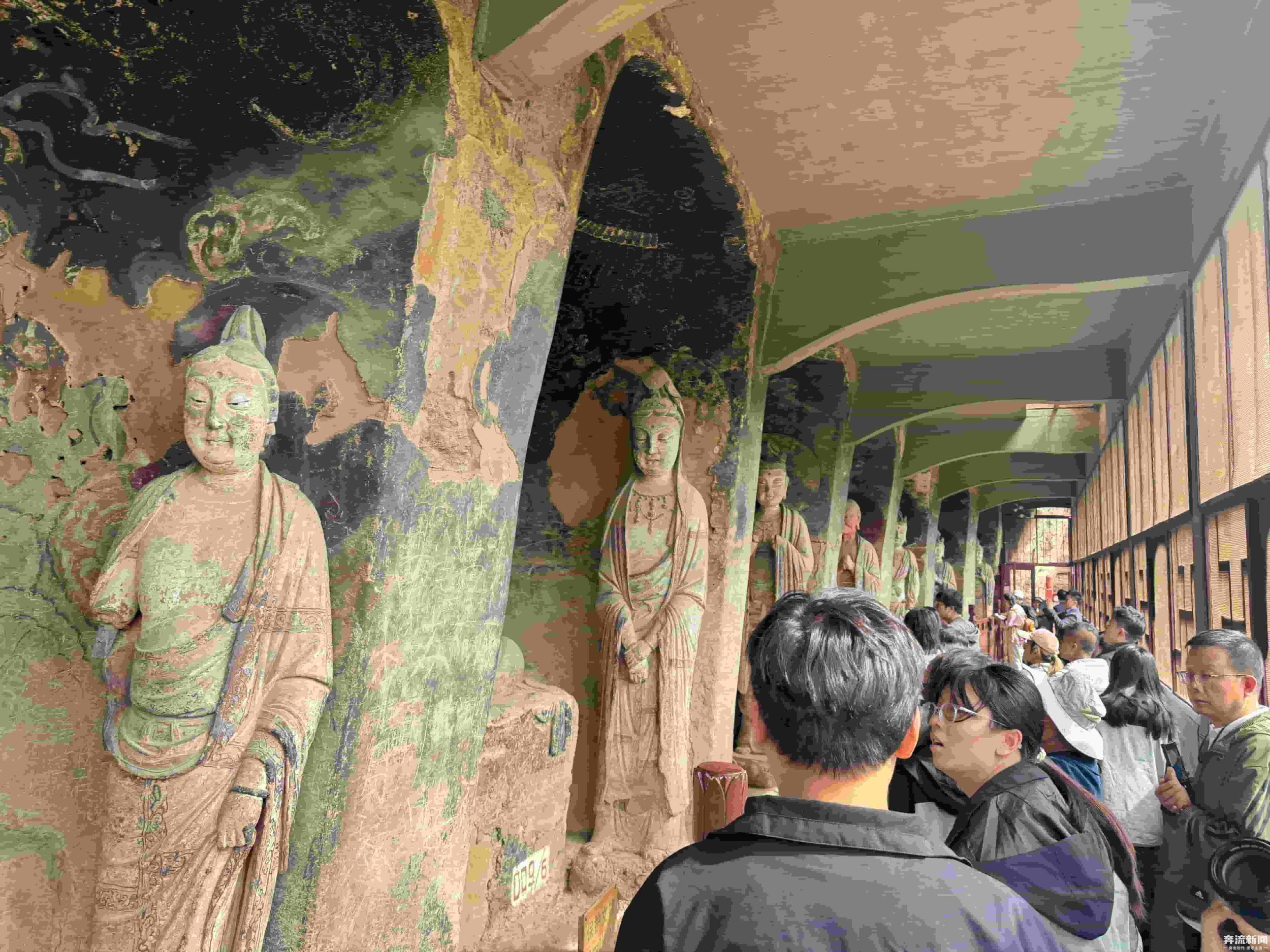 窟內(nèi)佛像造型各異,色彩鮮艷,既有莊嚴(yán)肅穆的佛祖、菩薩,也有生動(dòng)活潑的弟子、天王。這些造像中,雖然有石雕和個(gè)別的木雕,但主要以泥塑為主,體現(xiàn)了多朝代中國(guó)佛教泥塑造像藝術(shù)的發(fā)展演變規(guī)律。奔流新聞?dòng)浾吡私獾剑诩挤ㄉ?,工匠們運(yùn)用了圓雕、浮雕、鏤雕等多種技藝,使得佛像栩栩如生,富有強(qiáng)烈的立體感和動(dòng)感。麥積山石窟也因?yàn)槠洫?dú)特的“東方微笑”與精美的泥塑藝術(shù)聞名于世,被譽(yù)為“東方雕塑陳列館”。