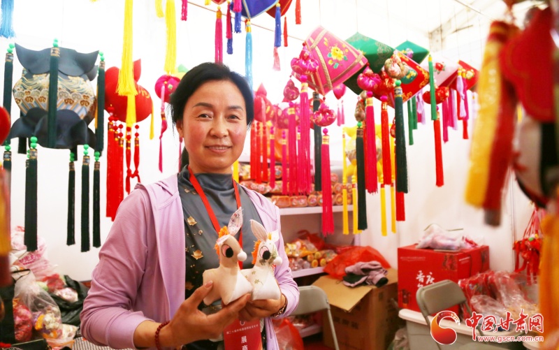 在展館的一角,來(lái)自慶城的一位香包繡制商戶喬志梅正在現(xiàn)場(chǎng)推銷著自己帶來(lái)的產(chǎn)品。其中驢形香包最為顯眼,據(jù)她介紹,驢形香包多數(shù)呈現(xiàn)黑色,有忠厚、老實(shí)之寓意,在當(dāng)?shù)貥O受喜愛(ài)。但她制作的驢形香包,通體為白色,鬃毛為粉色,驢耳一上一下較為可愛(ài)俏皮。