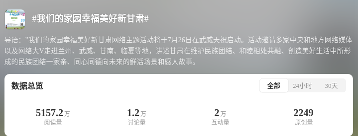 為深化互動(dòng)引導(dǎo),打造高流量IP,@甘肅網(wǎng)信、@快看甘肅等官方賬號(hào)發(fā)起社交平臺(tái)互動(dòng)話題#我們的家園幸福美好新甘肅#。結(jié)合#厚道甘肅##萬(wàn)千氣象看甘肅#等話題,@中新觀隴、@中國(guó)甘肅網(wǎng)、@甘肅好網(wǎng)民、@蘭州新區(qū)發(fā)布、@甘南融媒等賬號(hào)同步發(fā)力、同頻共振。目前,該話題總閱讀量超5530萬(wàn)人次,討論互動(dòng)量3.2萬(wàn)人次。