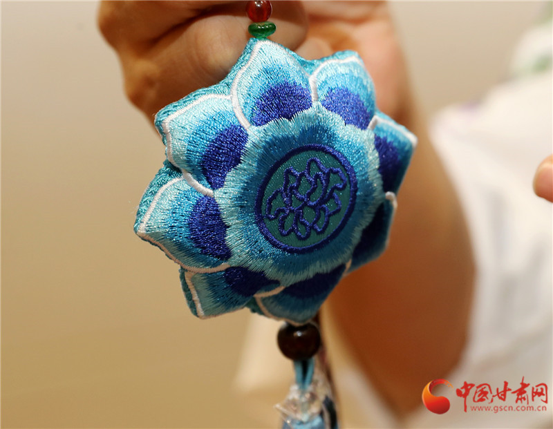 甘肅省博物館非遺集市的展臺(tái)前,包雨蕾的敦煌藻井香包一亮相就攥住了人的目光——青綠色絲線(xiàn)繞出的蓮瓣層層疊疊,中心飛天剪影隨腳步輕晃,清雅檀香混著花草香漫開(kāi)來(lái)。這款光是飛天飄帶針?lè)ň妥聊チ艘粋€(gè)月的新作,藏著她的心思:用慶陽(yáng)香包的針腳,把甘肅的千年文脈繡進(jìn)當(dāng)下生活。