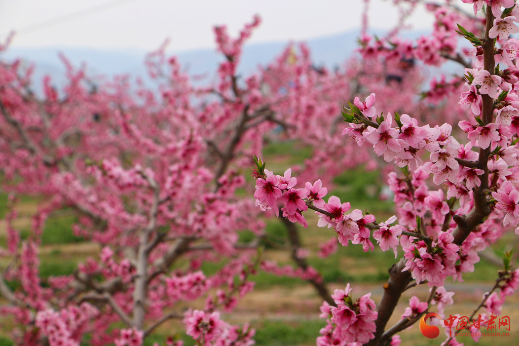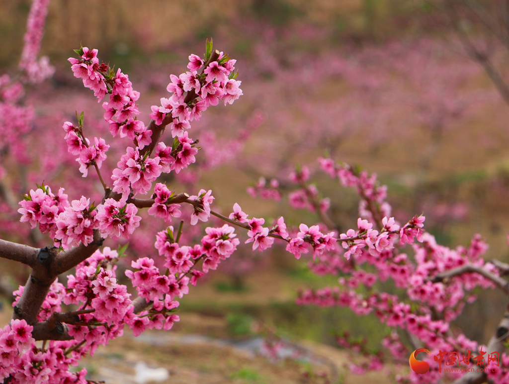 春風(fēng)拂過,桃花競(jìng)相綻放,粉花滿枝與遠(yuǎn)山交相輝映,宛如一幅詩意畫卷。