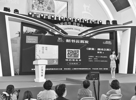 2020上海書展首次啟用了新書“云首發(fā)”的形式。8月15日,在《蒙曼:唐詩之美》新書“云首發(fā)”現(xiàn)場,讀者可以掃描大屏幕上的二維碼進(jìn)行圖書購買。