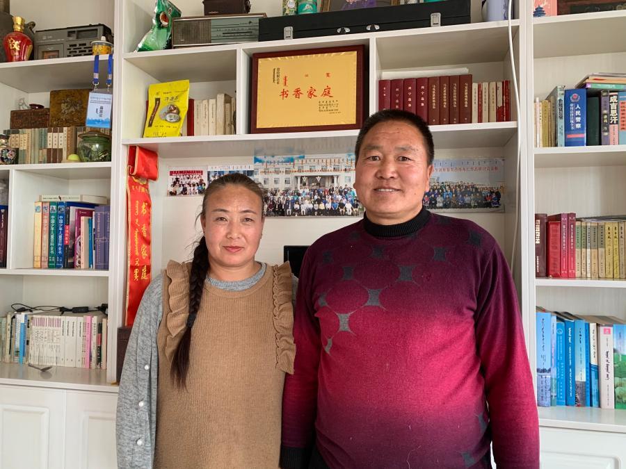 2020年12月10日,牧民敖特根達(dá)來和妻子在自家“書香家庭”獎(jiǎng)牌前合影。新華社記者 朱文哲 攝