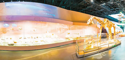 武漢自然博物館展示的中加馬門溪龍化石、硅化木和“龍”足跡化石墻。  本文圖片均由長江文明館(武漢自然博物館)提供
