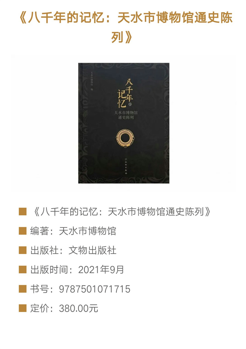 《八千年的記憶——天水市博物館通史陳列》文物圖錄一書在編輯出版過程中,凝聚了眾多工作人員的心血。天水市博物館學(xué)術(shù)研究部在文物的遴選確定、資料整理、編寫、校對(duì)方面做了大量的工作,文物保管部在文物照片拍攝、文物信息提供方面積極配合、全力協(xié)助,信息中心在展廳照片拍攝方面提供了幫助。本書中部分插圖,由甘肅省博物館、甘肅省文物考古研究所、麥積山石窟藝術(shù)研究所、張家川回族自治縣博物館友情提供。今由文物出版社正式出版,文物圖片精美、文字說明簡(jiǎn)潔明快,希望更多的讀者通過此書認(rèn)識(shí)天水,也希望更多的人能夠因?yàn)榇藭H臨天水市博物館感受天水厚重的歷史文化。