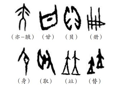 “象形者,畫成其物,隨體詰詘”(《說文·敘》),是根據(jù)客觀物象的形態(tài)輪廓來(lái)構(gòu)成文字符號(hào)的方法。象形字又稱作“文”,“文者,物象之本”。如“貝”就是一個(gè)海貝的象形,也指貨幣;“冊(cè)”,就是由竹簡(jiǎn)編起來(lái)的簡(jiǎn)冊(cè)的象形;“身”為妊娠的形象,突出腹部。