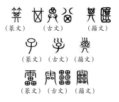 ?。ㄎ澹┧^“9353”,指的是《說文》所收全部正篆,即《說文》分析解釋的全部字。《說文》收字以篆文為“正”,作為標(biāo)準(zhǔn)字體,這就是許慎所說的“今敘篆文,合以古籀”的收字原則。“今敘篆文”,就是以篆文(小篆)作為標(biāo)準(zhǔn)正字,同時(shí)也會(huì)根據(jù)需要收列部分古文和籀文?!墩f文》所謂“古文”主要是孔子壁中書和民間所獻(xiàn)古文經(jīng)所用的文字,“籀文”即傳為西周晚期太史籀所編字書《史籀篇》上的文字。從《說文》來(lái)看,收入的古文、籀文,主要是與篆文有明顯差異的字形。如篆文“箕”“子”“雷”下所收列的古文、籀文: