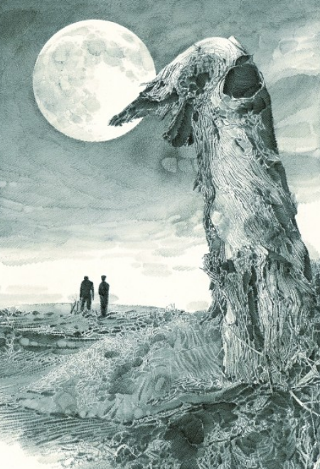 一輪滿月在大漠天空中懸浮著,兩個人行至遠方的沙地,并肩好似在暢談著什么??窃凇蹲x者》2019年第五期的這幅插圖,出自魯迅美術學院教授李晨之手,他以寫實的素描手法為陳忠實的文章《毛烏素沙漠的月亮》配圖,畫面細膩而充滿想象空間。