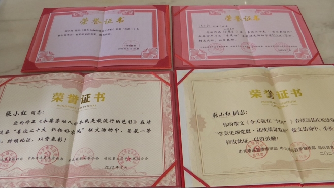 一分耕耘,一分收獲,機(jī)會(huì)總給有心人。如今,張小紅加入了靖遠(yuǎn)縣作家協(xié)會(huì)、白銀市作家協(xié)會(huì)、白銀市文藝評(píng)論家協(xié)會(huì)成為了會(huì)員,也增選為靖遠(yuǎn)縣政協(xié)委員。她的作品散見于《白銀文學(xué)》《烏蘭》等報(bào)刊雜志以及“靖遠(yuǎn)作協(xié)”“隴上風(fēng)情”“黃土情文學(xué)”等文學(xué)公眾號(hào);部分作品榮獲靖遠(yuǎn)縣建黨100周年“學(xué)黨史頌黨恩·述成績謀發(fā)展”征文二等獎(jiǎng),“喜迎二十大·教壇著華章”《未來導(dǎo)報(bào)》有獎(jiǎng)?wù)魑膬?yōu)秀獎(jiǎng)等……