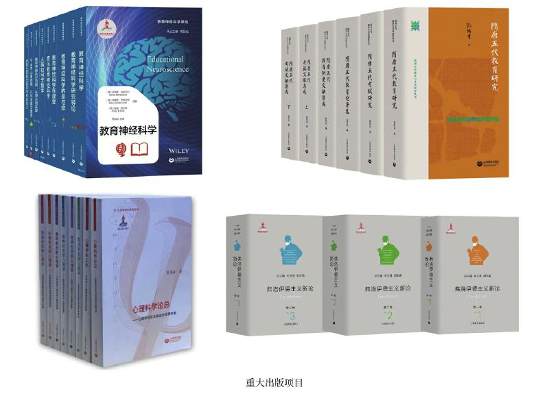上教社密切關(guān)注新時(shí)代教育發(fā)展的重大理論問題與現(xiàn)實(shí)問題,響應(yīng)國家教育發(fā)展戰(zhàn)略需求,精心布局學(xué)術(shù)專業(yè)出版“大項(xiàng)目”,連續(xù)入選國家重點(diǎn)出版物出版規(guī)劃、2013—2025年國家辭書編纂出版規(guī)劃,獲國家出版基金資助。這其中除前文中的大型專科工具書,還包括一系列教育與心理學(xué)原創(chuàng)研究和前沿研究成果:由中國教育史學(xué)者孫培青編著的“隋唐五代教育與考試研究叢書”,構(gòu)建了反映隋唐五代教育與考試全貌的教育理論體系和文獻(xiàn)資料體系,是中國教育史學(xué)科建設(shè)的一項(xiàng)學(xué)術(shù)文化積累工程;《中國課程史》以現(xiàn)代課程理論為分析框架,以歷史線索展現(xiàn)中國學(xué)校課程的新陳代謝;“教育神經(jīng)科學(xué)譯叢”(9冊)是我國首個(gè)聚焦教育神經(jīng)科學(xué)這一國際教育研究前沿領(lǐng)域的學(xué)術(shù)譯介系列;《中國傳統(tǒng)德育心理學(xué)思想新論》系統(tǒng)挖掘整理中華優(yōu)秀傳統(tǒng)文化中蘊(yùn)含的德育心理學(xué)思想,構(gòu)建中國特色心理學(xué)話語體系;我國第一套以大心理學(xué)觀,從本土心理學(xué)視角系統(tǒng)探索和解讀不同形態(tài)心理學(xué)的學(xué)術(shù)系列“心理學(xué)形態(tài)研究系列”(6冊),全景考察心理學(xué)的命運(yùn)與前途,深入探索中國本土心理學(xué)的選擇與突破;《弗洛伊德主義新論》(三卷)匯聚國內(nèi)弗洛伊德主義研究領(lǐng)域的權(quán)威學(xué)者,歷史展現(xiàn)弗洛伊德理論的百年發(fā)展歷程,提供弗洛伊德主義研究的“全景圖”。這些重大出版項(xiàng)目為構(gòu)建中國特色自主知識體系,建設(shè)中國教育學(xué)和心理學(xué)學(xué)科體系、學(xué)術(shù)體系、話語體系發(fā)揮了重要作用。