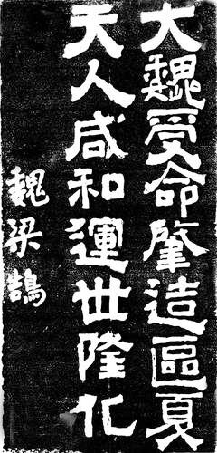 他的書法作品中,具有代表性的是一幅“大魏受命,肇造區(qū)夏,天人咸和,運(yùn)世隆化”的字。這幅字今人能看到拓片。人們?cè)u(píng)價(jià)說(shuō):書跡骨氣凝重,筋力豐足,筆勢(shì)雄健,意志戇宕。