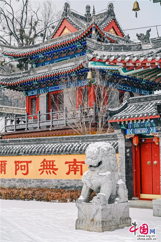 聽說這座寺廟的歷史可以追溯到400多年前,門前的石獅子十分莊嚴(yán),傳遞著佛門圣地的意境。腳踩在雪地上,發(fā)出“嘎吱嘎吱”的聲音;進(jìn)入了廟內(nèi),就能看見白雪覆蓋的木質(zhì)小橋;還有廟宇內(nèi)回廊上精致的鏤空鉤花和印著“溫泉寺”字樣的燈籠。