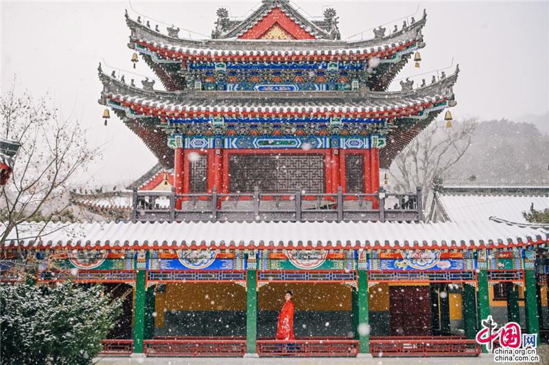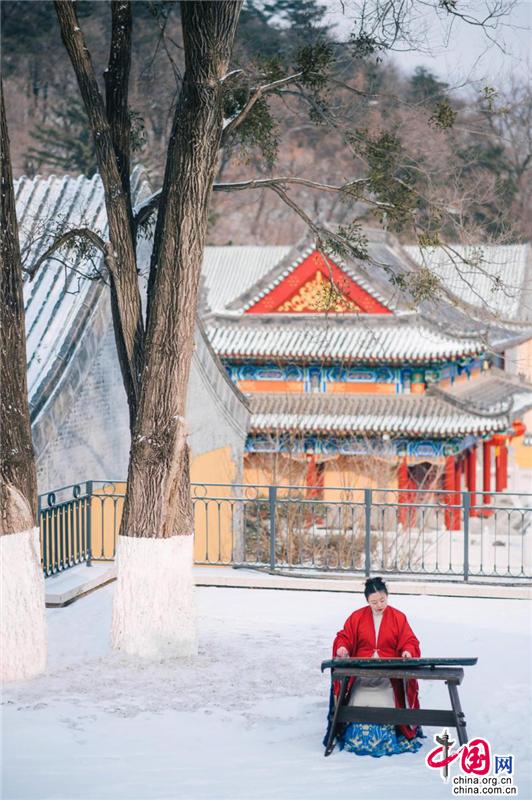 寺廟高處,古榕旁、雪地上,還有另一位古風(fēng)裝束之人在彈奏古箏,聲意蕭瑟。伴隨空靈的山河意境,飄至遠(yuǎn)方。冬季最美的畫面,也不過如此。