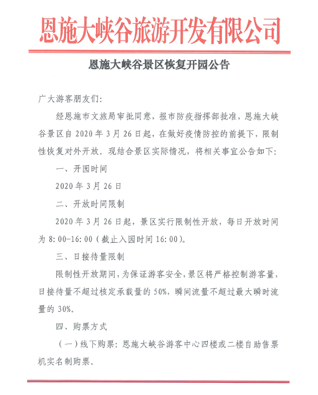 恩施大峽谷旅游開發(fā)有限公司今天發(fā)布《恩施大峽谷景區(qū)恢復(fù)開園公告》(以下簡稱《公告》),2020年3月26日起,恩施大峽谷景區(qū)恢復(fù)開園。值得注意的是,恩施大峽谷將實行限制性開放,每日開放時間為8:00-16:00(截止入園時間16:00)。