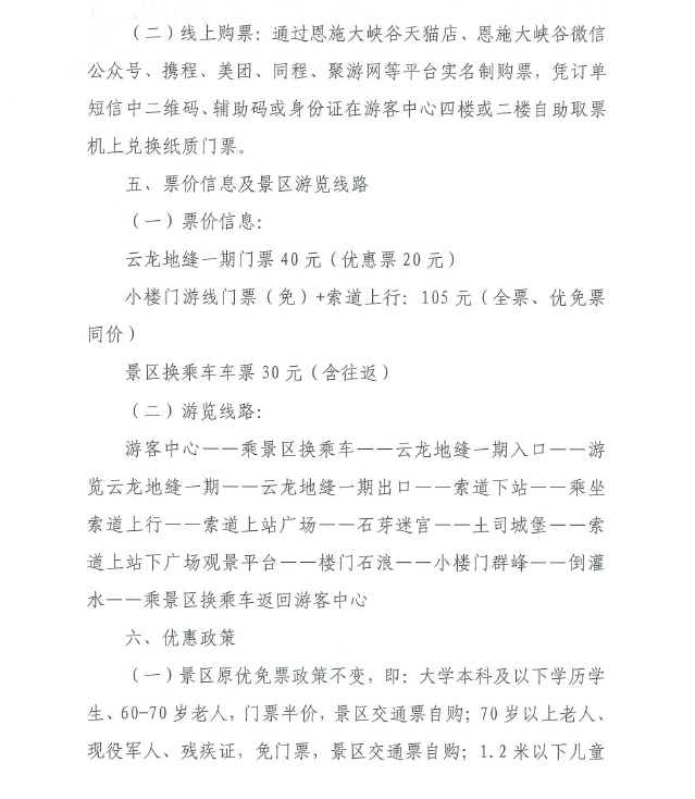 優(yōu)惠政策方面,景區(qū)原優(yōu)免票政策不變;與此同時,全國醫(yī)護人員、援鄂醫(yī)療隊員、天津援助恩施醫(yī)療隊員按湖北省文旅廳、恩施市文旅局相關(guān)優(yōu)惠政策(憑有效證件)免門票;天津市民憑有效證件享受門票半價。