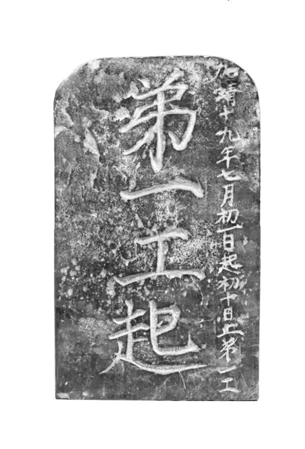 這塊“長(zhǎng)城工牌”,高19厘米,寬11.5厘米,厚2厘米。兩面陰刻楷書,共58字,正面豎刻兩行字,共22字,正中刻“弟一工起”四個(gè)大字,右邊刻“加靖十九年七月初一日起初十日止第一工”一行小字;背面文字分上下兩部分,共36字。上部刻四個(gè)大字“蔡止梅起”。下部豎刻六行32個(gè)小字“一工李清隊(duì)起,二工梅喜隊(duì),三工王元隊(duì),四工侯勛隊(duì),五工位宗隊(duì),六工張曇隊(duì)止”。