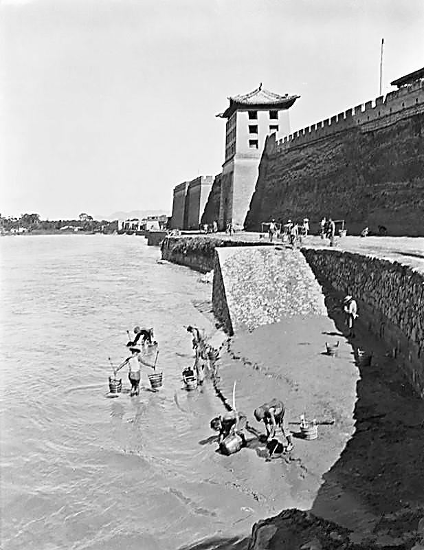 第二張是水客子在黃河中取水的情形??雌饋?lái),似乎是黃河大水之后,人們從河中取水。黃河邊的石堤下,堆積的淤泥,還沒有清理。以前,蘭州城墻的位置,就是今天的南濱河路。從淤泥堆積的高度看,這次黃河大水應(yīng)該不小。