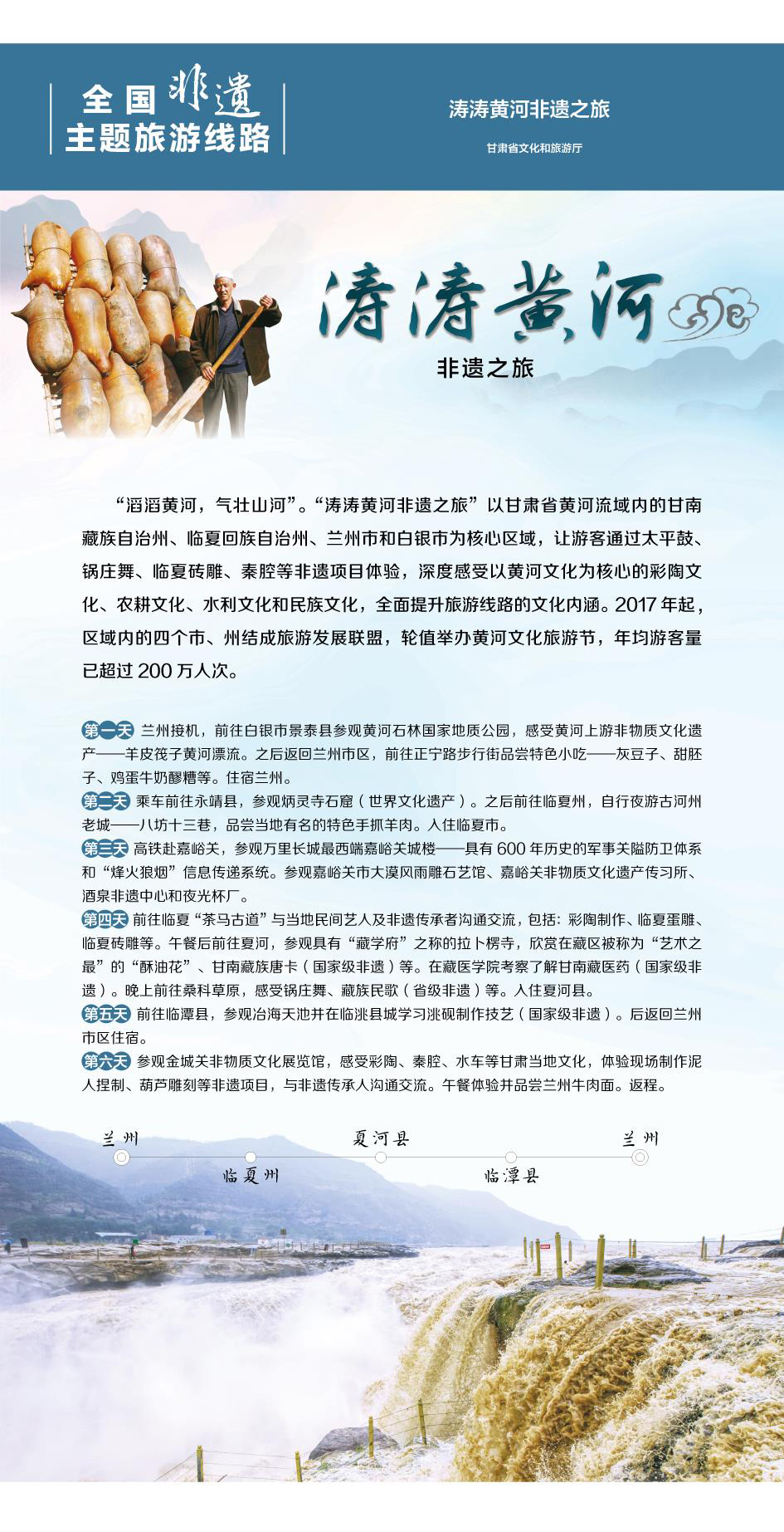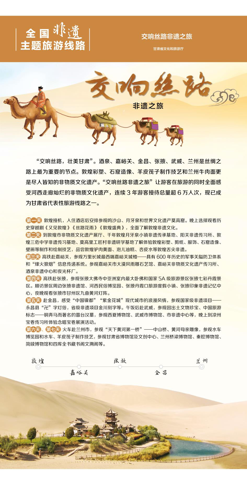 中國(guó)甘肅網(wǎng)10月19日訊 (本網(wǎng)記者 張?zhí)m琴)10月18日,在貴州舉辦的“中國(guó)丹寨非遺周”活動(dòng)期間,文旅部首次發(fā)布了“全國(guó)非遺主題旅游線路征集宣傳活動(dòng)”入選線路名單。由甘肅省文旅廳組織選送的“交響絲路非遺之旅”和“濤濤黃河非遺之旅”2條非遺主題旅游線路同時(shí)入選,我省成為全國(guó)唯一入選兩條線路的省份。