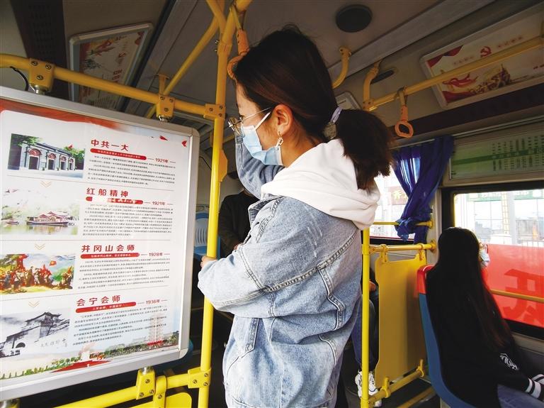 黨史學習教育主題車廂的車體外部掛有醒目的黨史宣傳標語,走進車廂,風道展板上以黨史故事的形式,圖文并茂、生動形象地展示著紅船精神、井岡山精神、長征精神、遵義會議精神、延安精神、西柏坡精神、抗美援朝精神、戰(zhàn)疫精神等內(nèi)容。車廂內(nèi)的座椅靠背、宣傳欄等處也印有不同的黨史宣傳知識,公交車廂成了黨史學習教育的流動“微課堂”。乘坐在黨史學習教育主題公交車上,乘客便可重溫中國共產(chǎn)黨波瀾壯闊的輝煌歷程,汲取民族復興的精神力量。